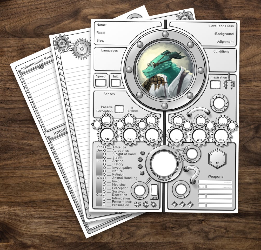 Bring your tinkering and machinations to life with this finely detailed, 5e custom character sheet, intended for use with the Artificer class.