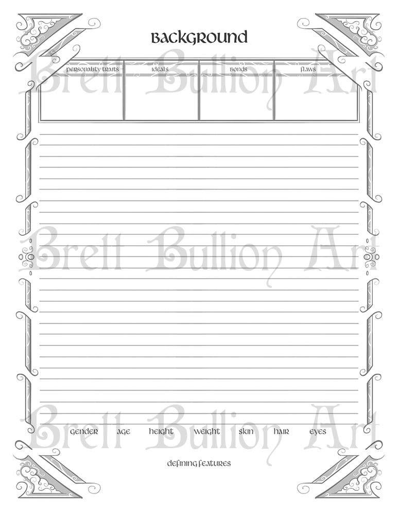 Finely detailed custom character sheet for use with D&D 5e. These sheets are intended for use with the Monk class. It comes with space to keep track of all of your traits and feats, inventory, backstory, and campaign notes.