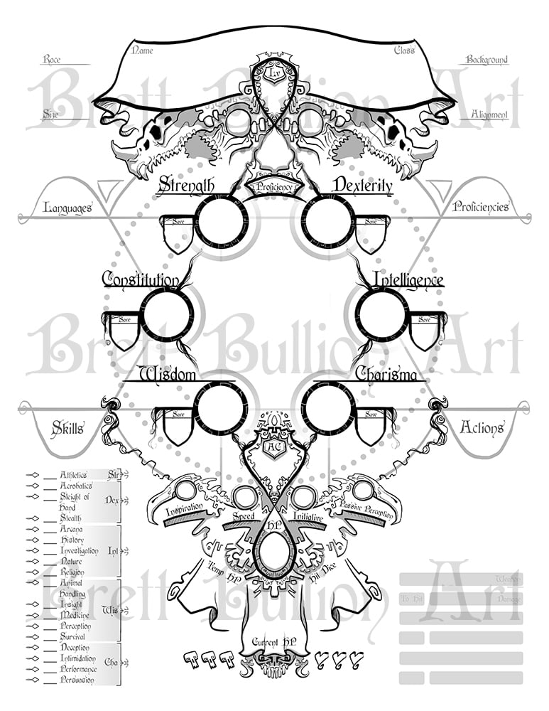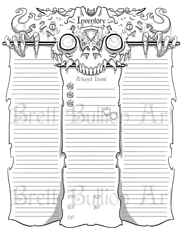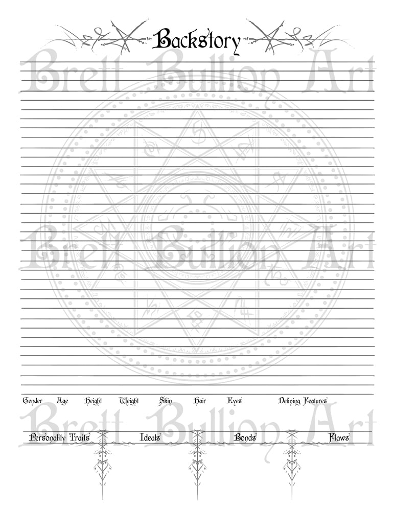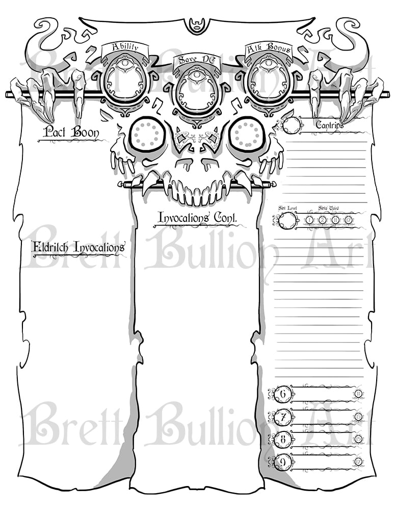 Finely detailed custom character sheet for use with 5e systems. This sheet is intended for use with the Warlock class and comes with its own unique spell page dedicated to warlock players which should make keeping track of invocations and spells much easier. It also includes a standard spell page for any other spellclasting class you might want to play!